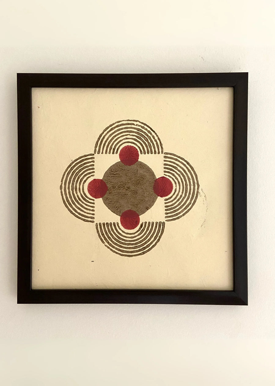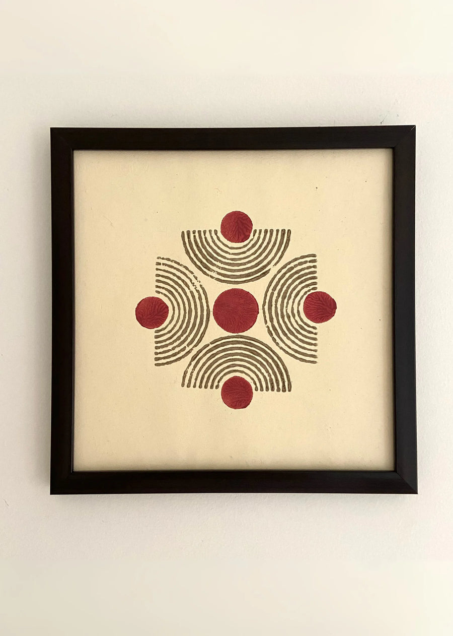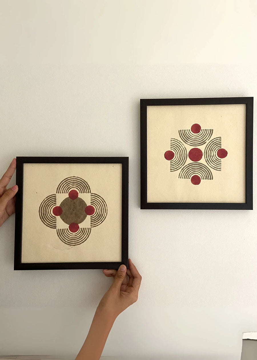 Introducing our exquisite wall frames featuring handblock printed artwork on meticulously crafted handmade paper. Each frames is a masterpiece, showcasing the timeless beauty of traditional artistry combined with modern elegance. Adorn your space with these unique pieces, perfect for adding a touch of sophistication and charm to any space. Handcrafted with care, theme frames are not just decor but statement of style and culture. Bring the allure of artisanal craftmanship into your home or office with these wall frames. ARTWORK: Breathe in, Breathe out - Red (Set of two) General Care: Wipe with dry cloth Assembly: Simply hang on your walls and style your space. Dimensions: 10" x 10" (2)
