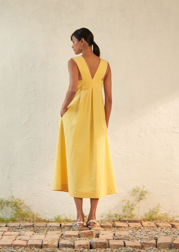 Step out in style and soak up the sunshine with this delightful midi dress. Crafted from fine cotton fabric in a captivating yellow hue, it sets the perfect tone for a nice day out. Featuring a charming square neckline, retro broad straps, and a breezy center pleat, this dress exudes effortless elegance. Whether you're strolling through the park or enjoying brunch with friends, this versatile piece promises to elevate your daytime ensemble with flair and finesse.
