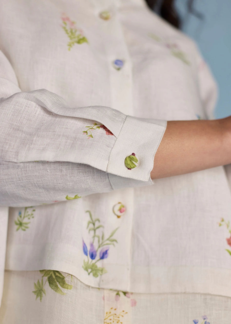 Top - A statement A-line shirt crafted from our signature soft pure linen and soft flowing sheer linen. Featuring two hand-illustrated delicate multi-colour floral prints - a jaal print and a buta print, the shirt is finished with unique mixed material buttons including linen fabric buttons and a crochet button, colourful thread buttonholes and faggoting stitch detailing. Leina is perfect for evening gatherings and social events, offering both comfort and versatility. Pant - Timeless linen culottes with pleats at the waistband, comfortable pockets and an soft elasticated back waistband in our signature yarn-dyed linen with a sheer linen patchwork band at the hemline with a tonal faggoting stitch detail. The Mapa pairs beautifully with everything.