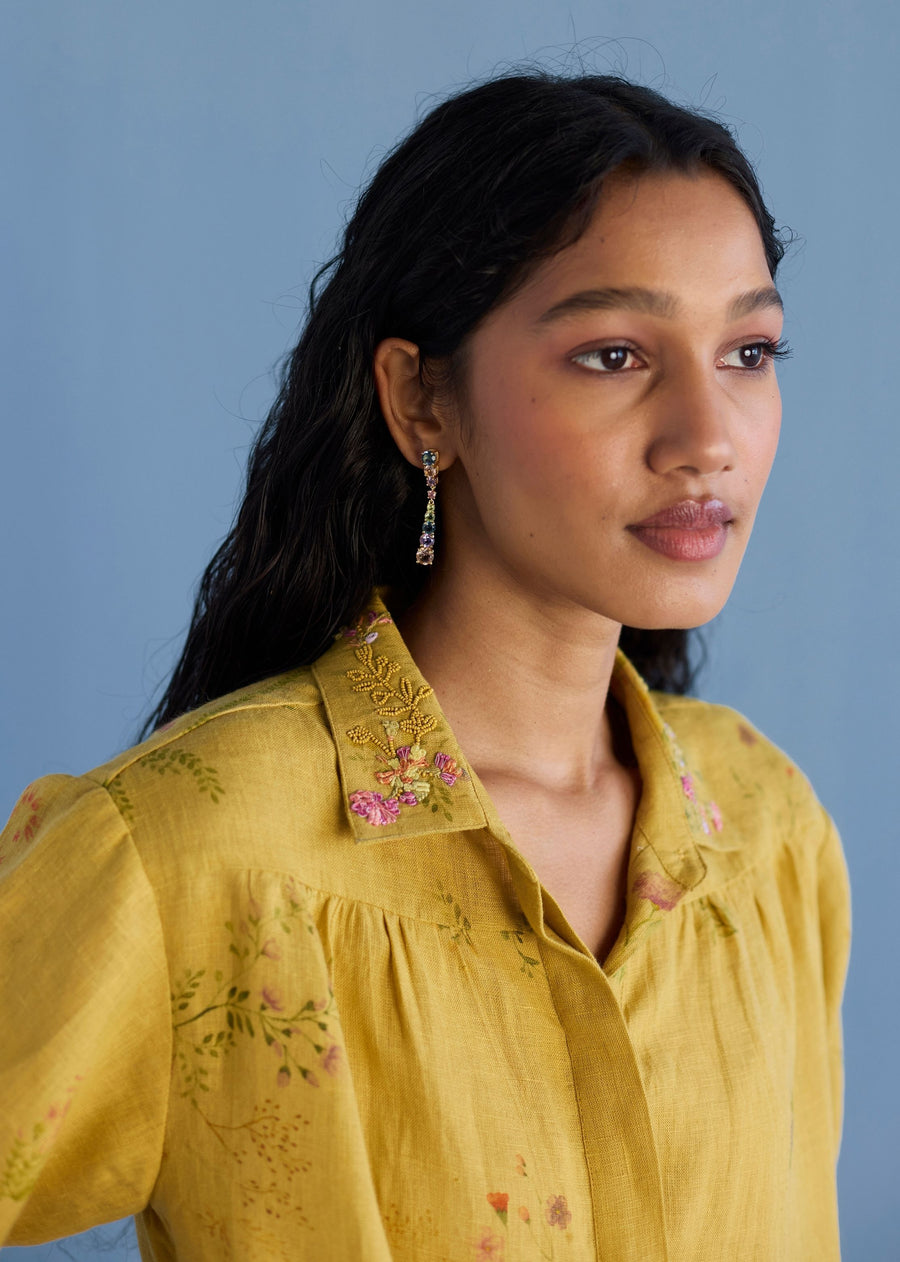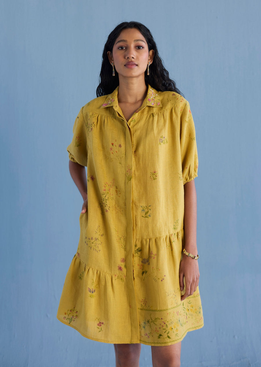 A summer panelled dress designed by thoughtfully patching two floral printed yarn-dyed linens in a jaal print and a buta (motif) floral print. The Sia summer dress has a intricate and textural hand-embroidered floral embroidered collar, pockets and a border floral print at the back and side panels. A floral printed linen belt is included with the dress.