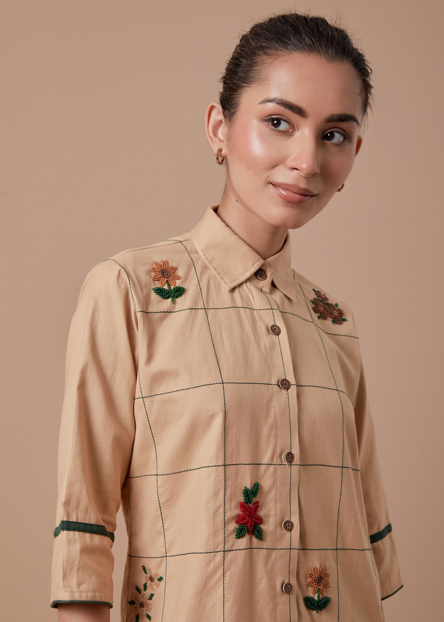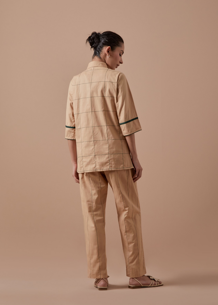 Rooted in tradition yet styled for the present, the AMETHYST CO-ORD SET brings timeless charm to modern wardrobes. The shirt features delicate contrast grid stitching and hand-embroidered bead floral motifs that celebrate artisanal craftsmanship. Paired with relaxed-fit trousers featuring subtle contrast topstich detailing, this look offers a perfect balance of structure and ease. Designed for the discerning dresser, it’s an elegant nod to slow fashion and expressive individuality.