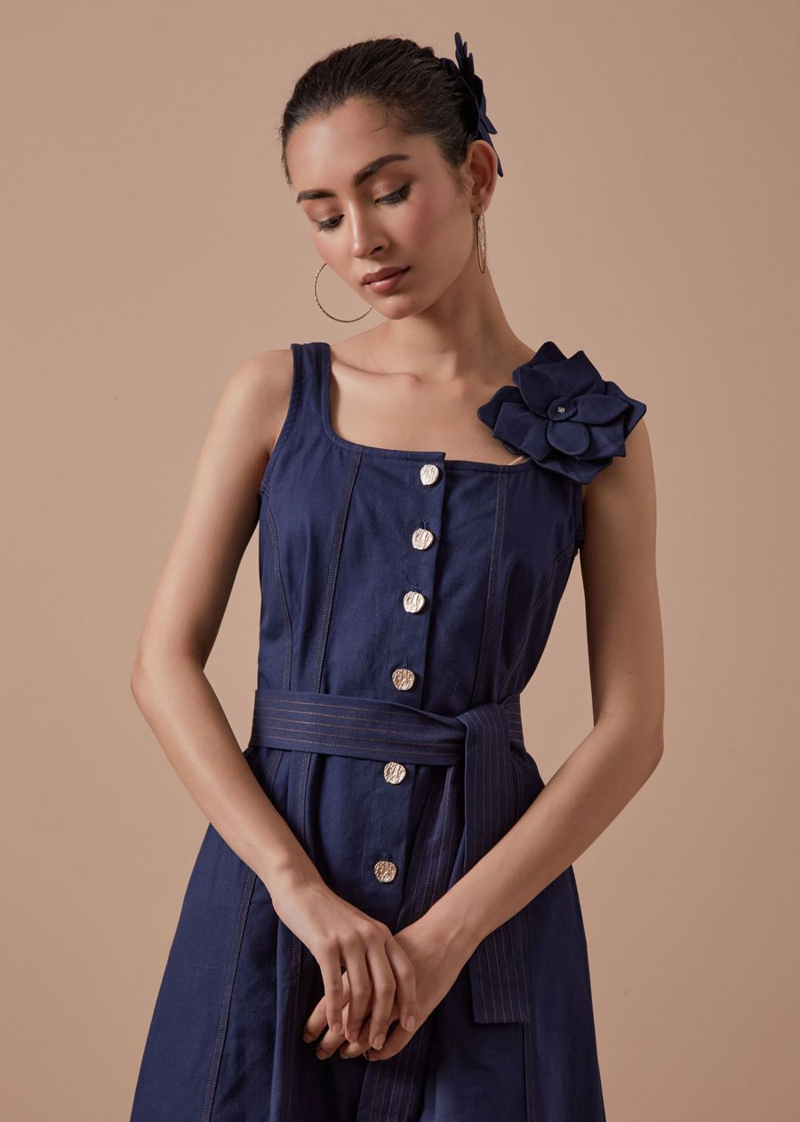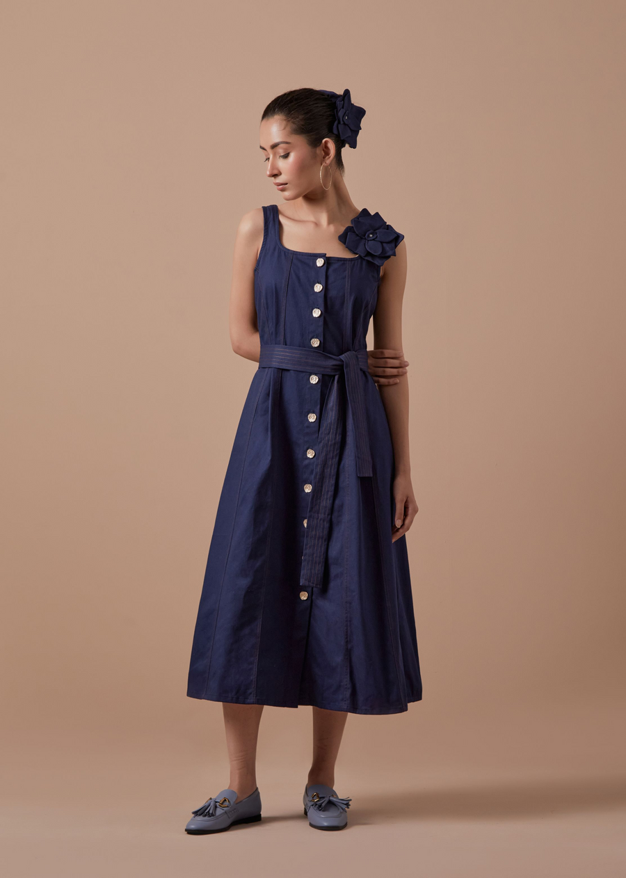 THE BOSS DRESS is a stylish and refined sleeveless midi dress with feminine and functional elements. It features contrast topstitching that accentuates its paneled construction. This dress blends modern elegance with a vintage-inspired charm, making it suitable for day events, casual occasions, or even creative workplaces.