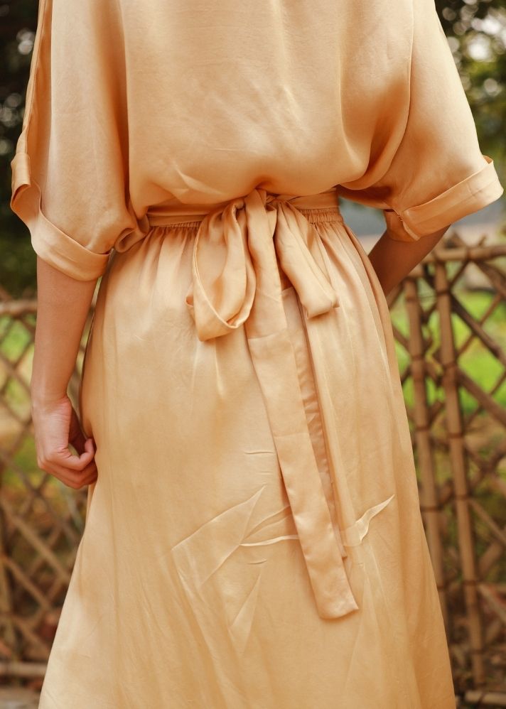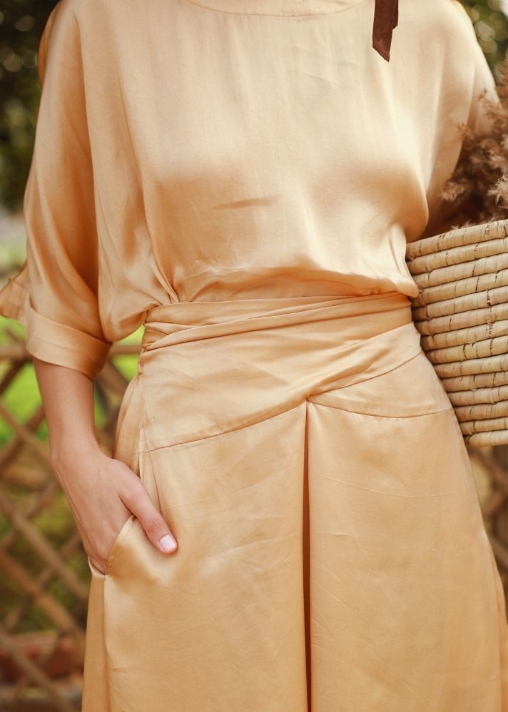 High-waisted wrap-style skirt with a knot detail at the front, adding elegance to its flowy silhouette. Its versatile design makes it perfect for both casual and formal occasions. Pair it with a boxy top for a coordinated look or a fitted blouse for a more polished outfit. Note: Each piece may come with an extra embroidery or patch but the overall look and feel of the piece are not changed. These pieces are a part of a limited edition collection, the stock is made till the raw material is available.