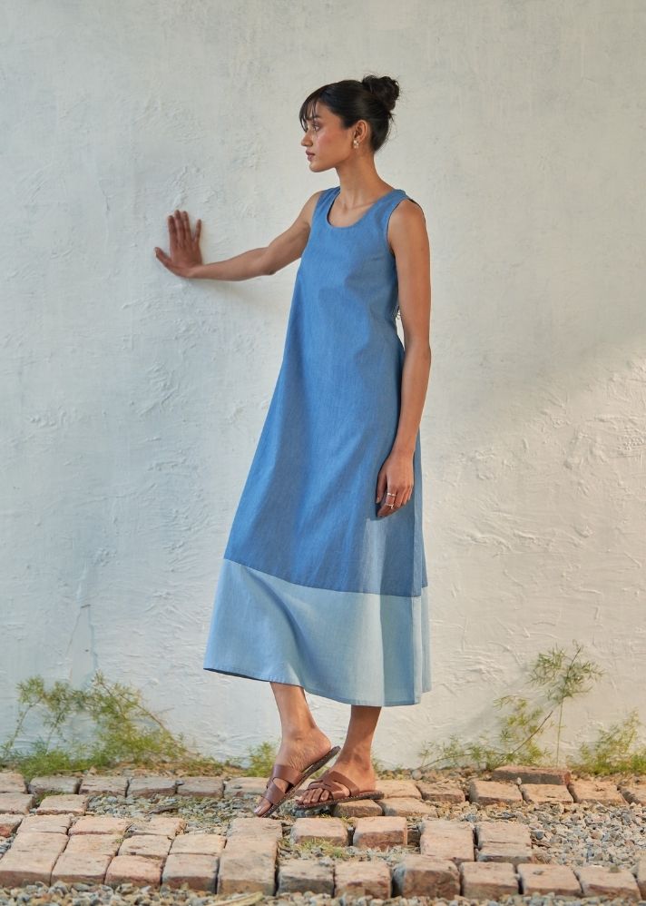 This dual-toned dress is crafted from soft denim fabric, designed to gently fall through the frame with a scoop neck and a curved hem. Sleeveless with a voluminous flare, it allows you to sway swiftly from morning to evening. Add it to your collection of no-brainer outfits.
