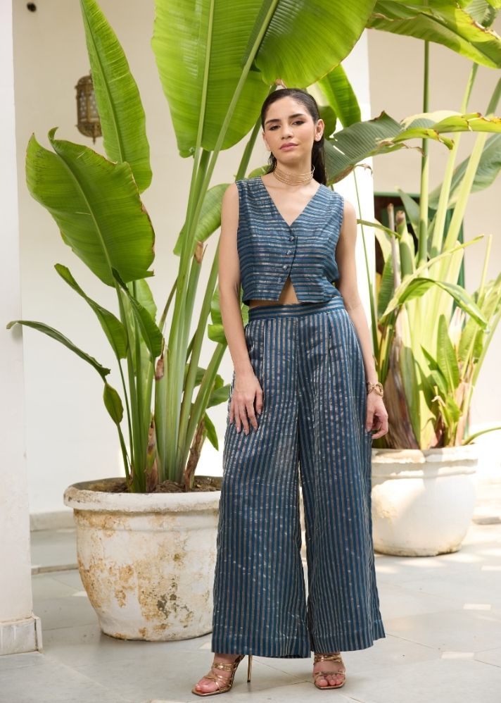 The Sabya coord set is crafted from hand woven blue zari chanderi fabrication with waistcoat & high waisted wide legged trousers.