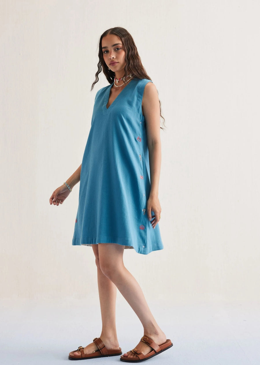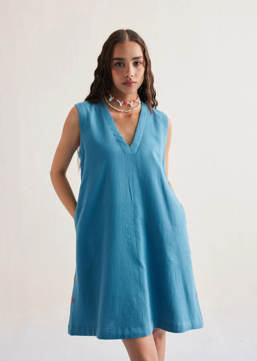 Relaxed fit, sleeveless, v-neck, mini dress crafted in azo-free dyed double gauze organic cotton fabric, hand embroidered with ocean life inspired motifs. Timeless looks like this dress are a must for conscious closets. Dress it up with jewelry and heels for when you go out, or keep it super simple for casual occasions.