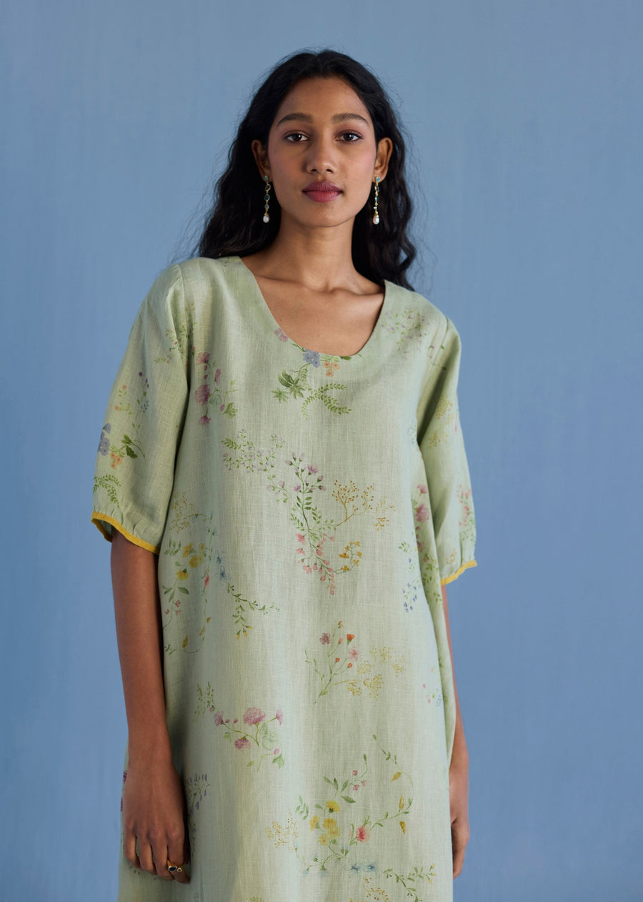 An A-line floral printed dress handcrafted in our signature yarn-dyed linen in two hand-painted prints - a jaal floral print and a buta (motif) floral print. The Nami is designed with comfortable pockets, a printed floral border vertically placed at the back with intricate pintucks, and a pop coloured edge detail at the sleeve and bottom hem.