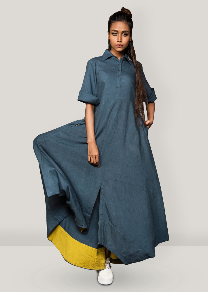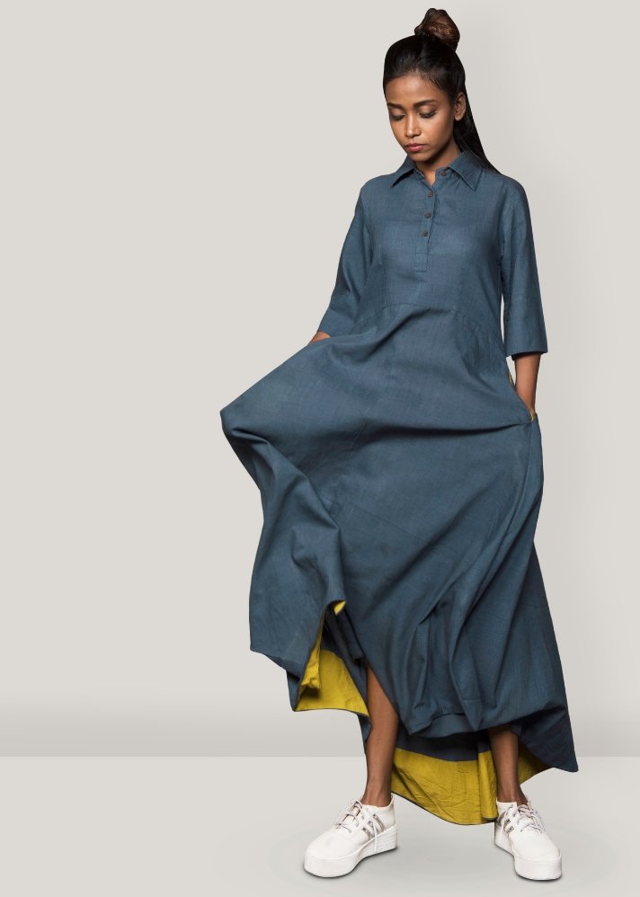 This dress has a beautiful side and back drape. Khadi is India’s signature fabric backed by an incredible history.The weaving method of Khadi is downright simple and traditional. It is manufactured in two steps: first, the fiber is converted into yarn using spinning wheels (better known as Charkha) and then the yarn is woven into a fabric with the help of looms. The entire process is performed with hands with no usage of electricity, which is quite incredible in this age of technology and globalization. Also, khadi is the most natural, organic fabric. Ideal for hot weather conditions, it keeps the wearer cool in summers and warm in winters.ÂÂ