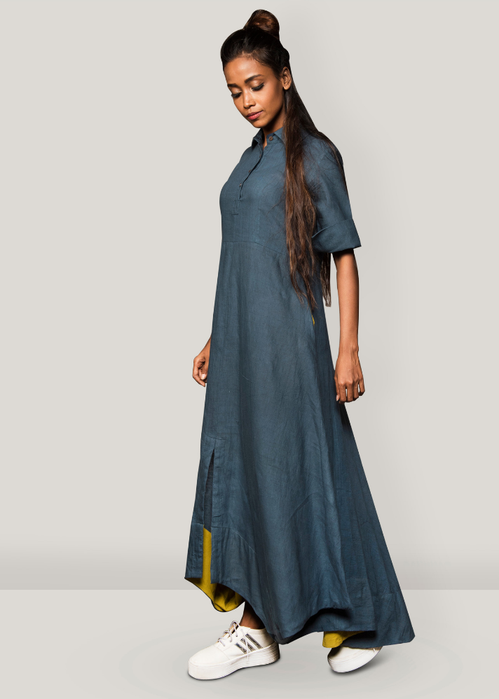 Asymmetric dress made with roll-up sleeves, collared neck, and front cut.