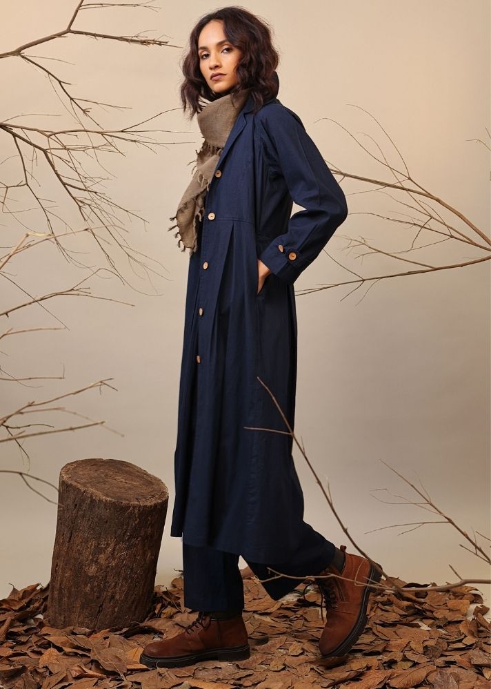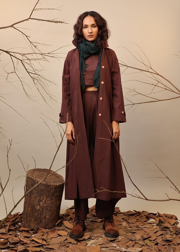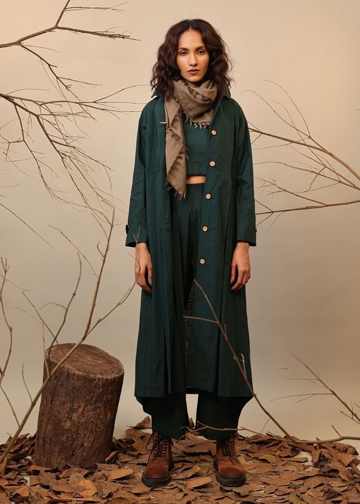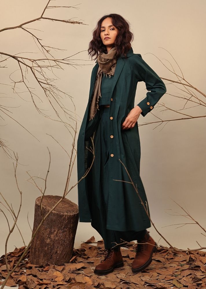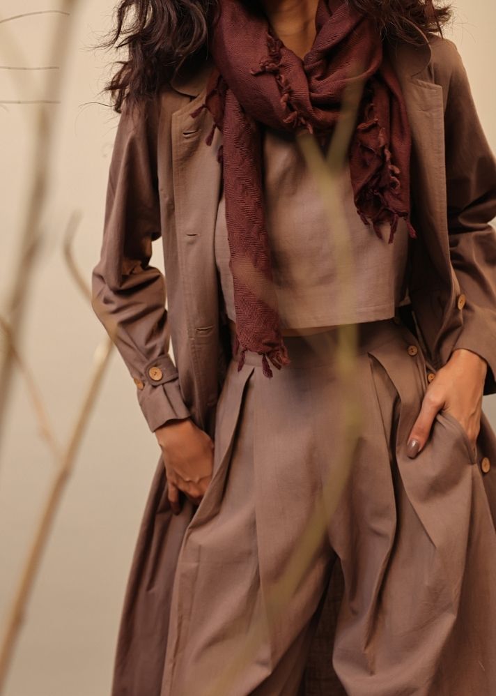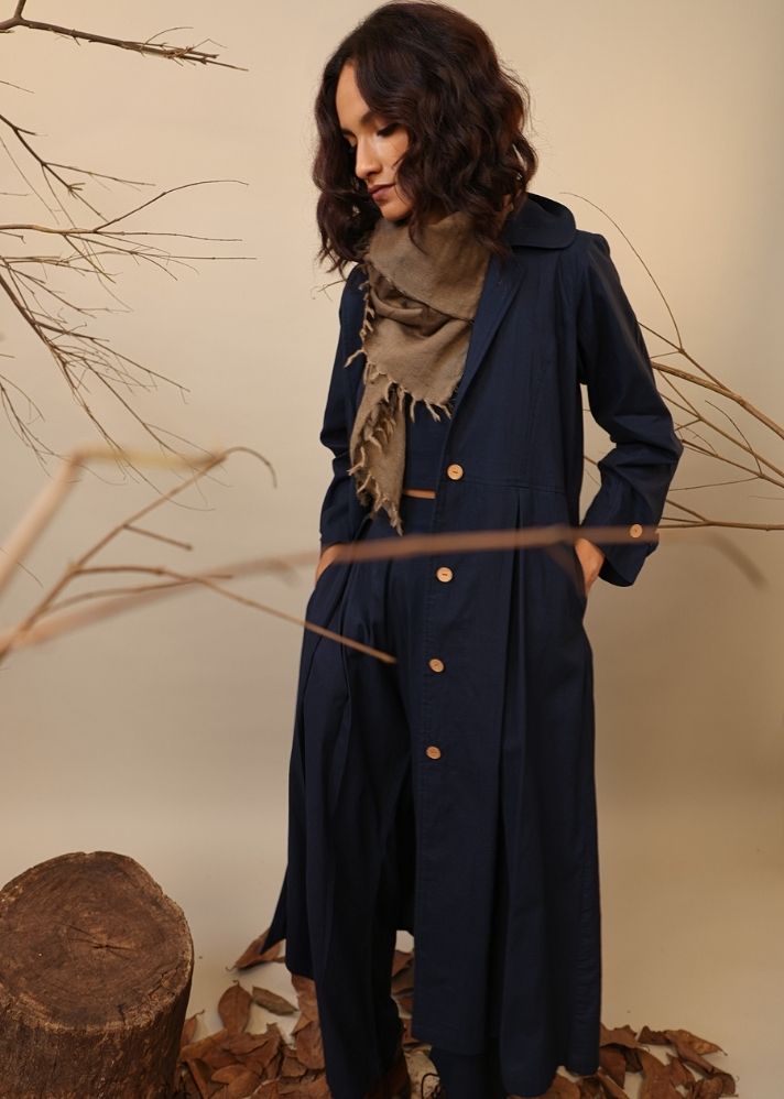 Full length jacket with peter pan collars and full sleeves with side pockets teamed with raglan style crop top made in handspun cotton and with pleated cowl pants with waist band and side button opening. Total set comes in 3 pcs. PLEASE NOTE THE SCARF IS NOT INCLUDED.