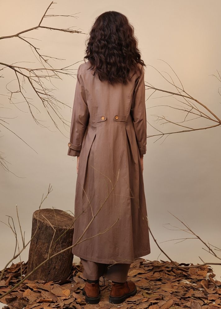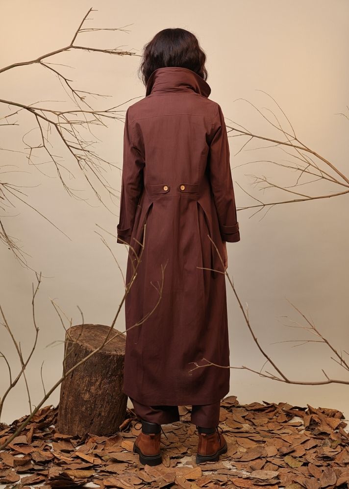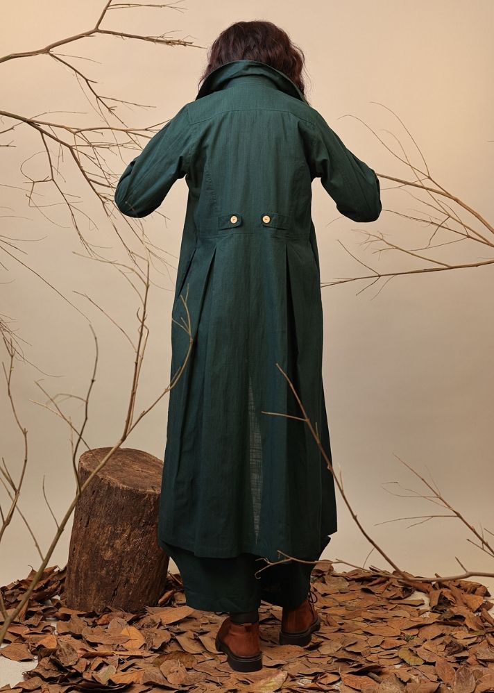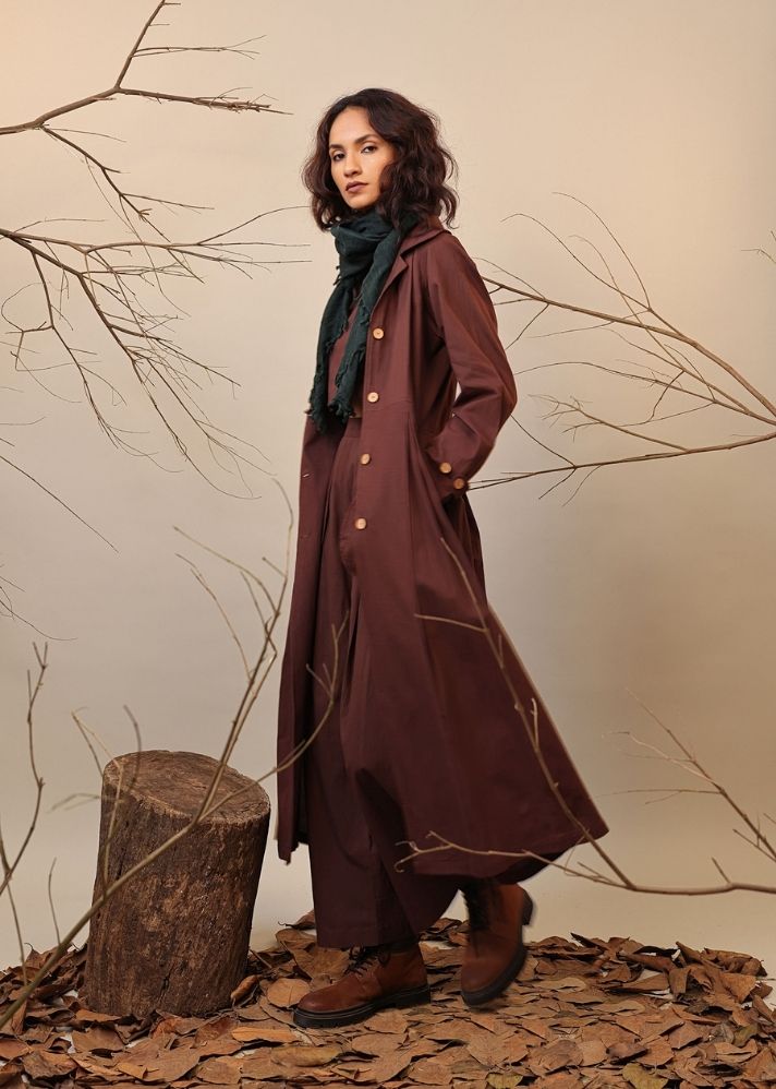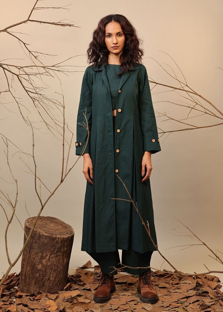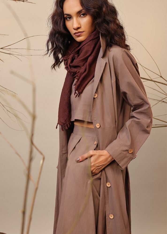 Full length jacket with peter pan collars and full sleeves with side pockets teamed with raglan style crop top made in handspun cotton and with pleated cowl pants with waist band and side button opening. Total set comes in 3 pcs. PLEASE NOTE THE SCARF IS NOT INCLUDED.