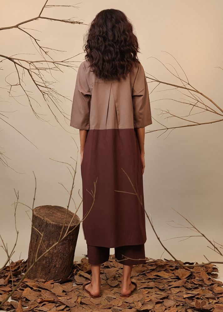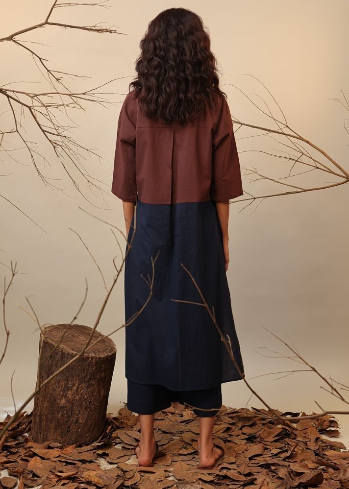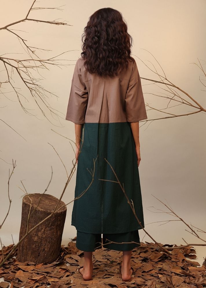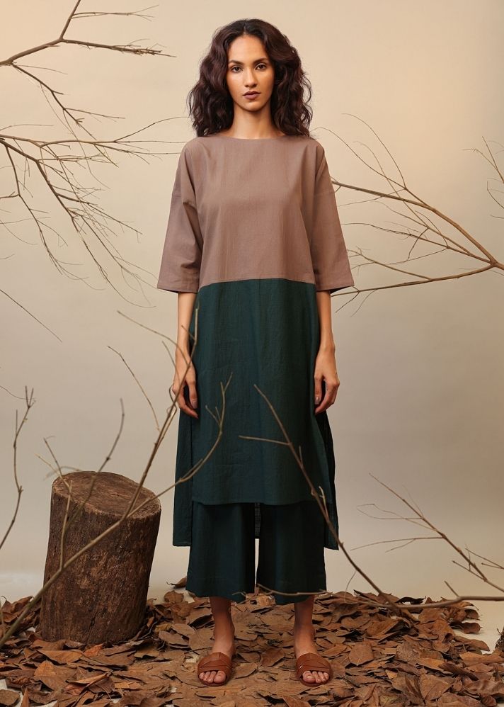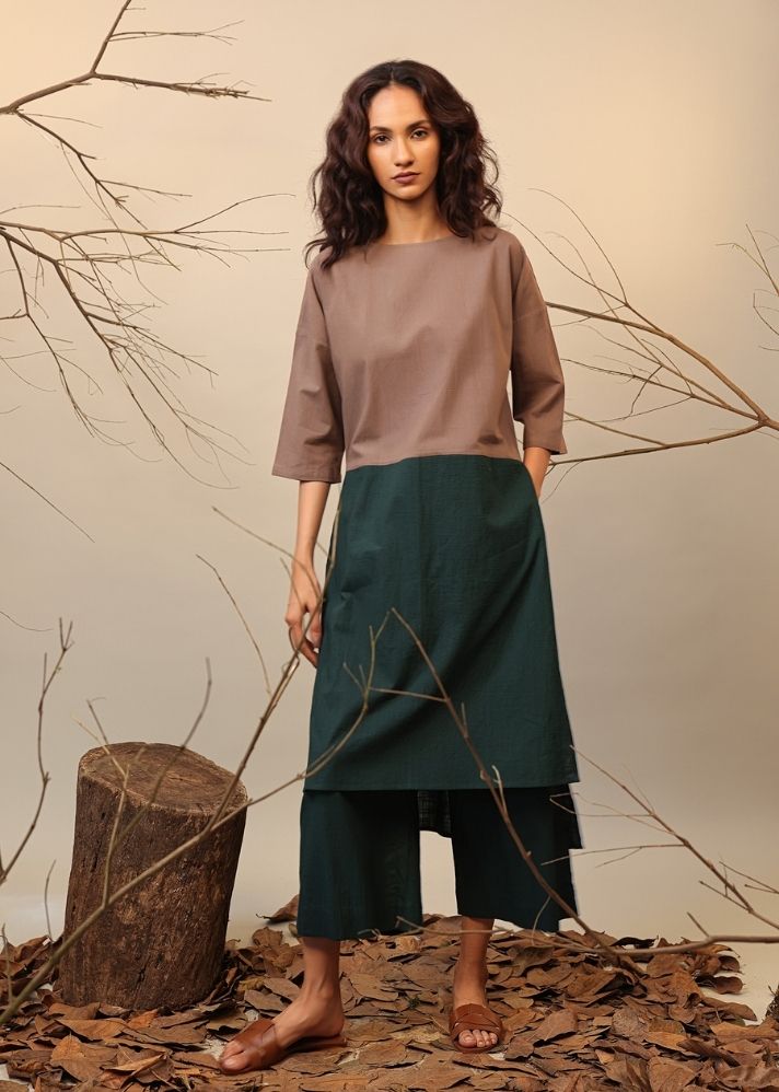 A short and long colour block tunic with back button opening. Team it up with the capre pants from this collection to complete the look. Wear a scarf of any colour from this collection and have fun styling in winters. Please note: Scarf and Pants are not included in this style listing.