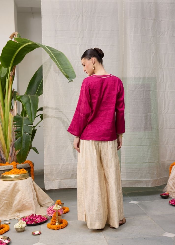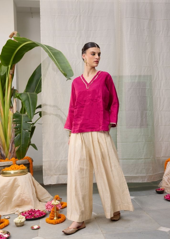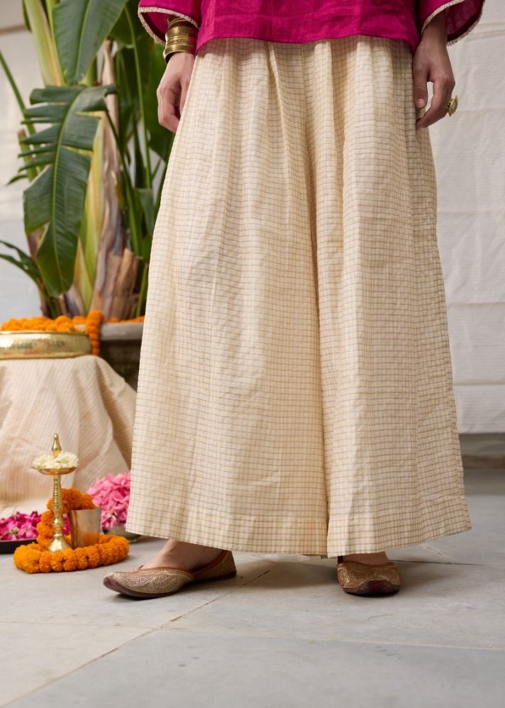 Kaveri Trouser is crafted from our hand woven zari chequered chanderi pleated wide legged pants.